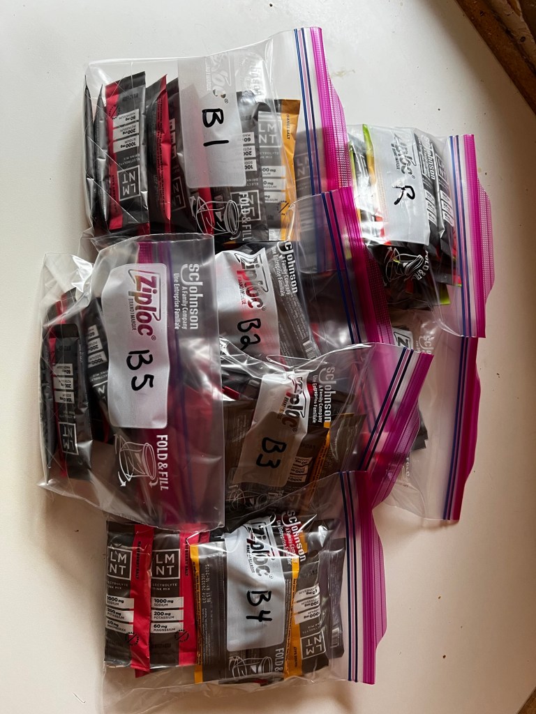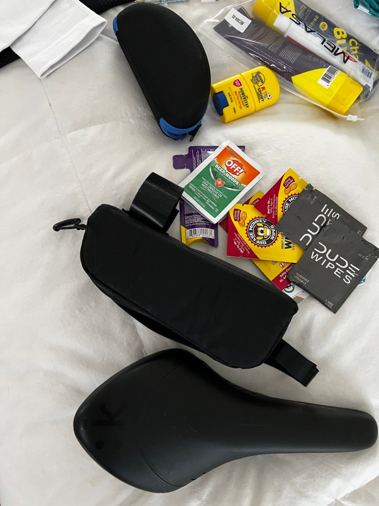 - Toiletries – this is very broad and needs access daily. I am the king of lotions – you name it, I got it – skin, hair, joints, muscles, chamios butter (better known as butt cream). Add-in your personal hygiene stuff and contact lens care, it’s a big, surprisingly, awkward pile. You throw in any food items too, like powder drink mixed or bars.