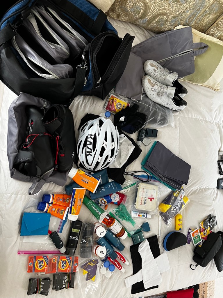 - Lastly are clothes and shoes – bike clothes (jerseys, bibs/shorts, socks plus spares for Murphy) for 10 days, rain gear, jackets, off bike clothes for time at the bar, pj’s, swimsuit, caz shoes and flip flops…there’s so much!