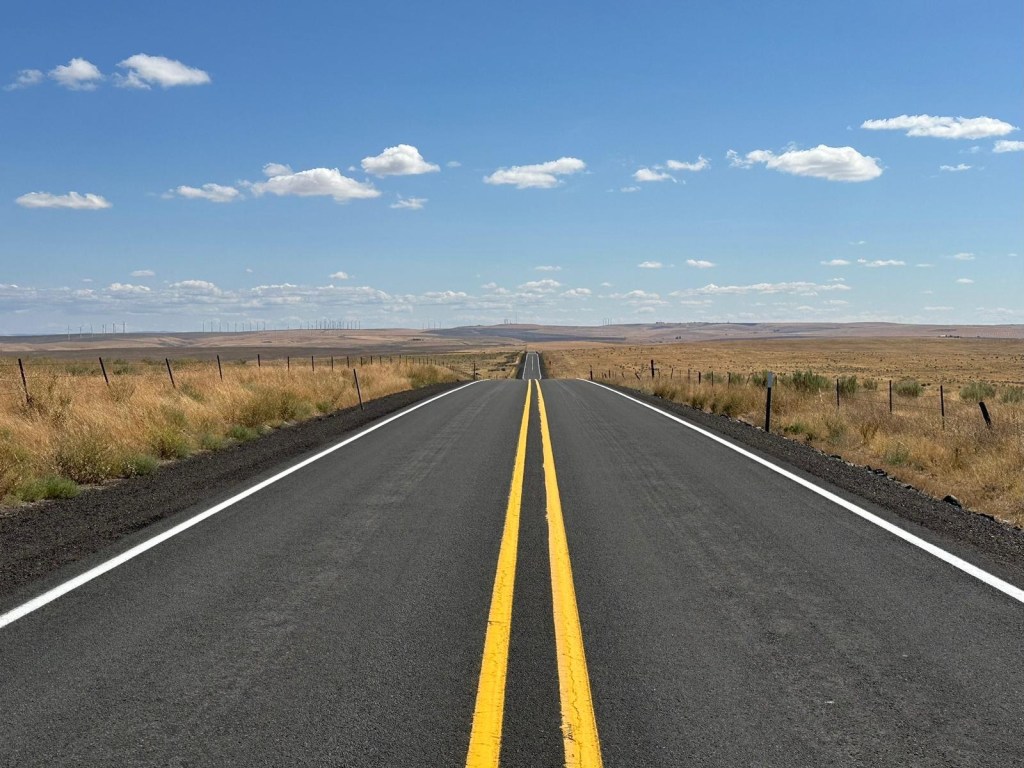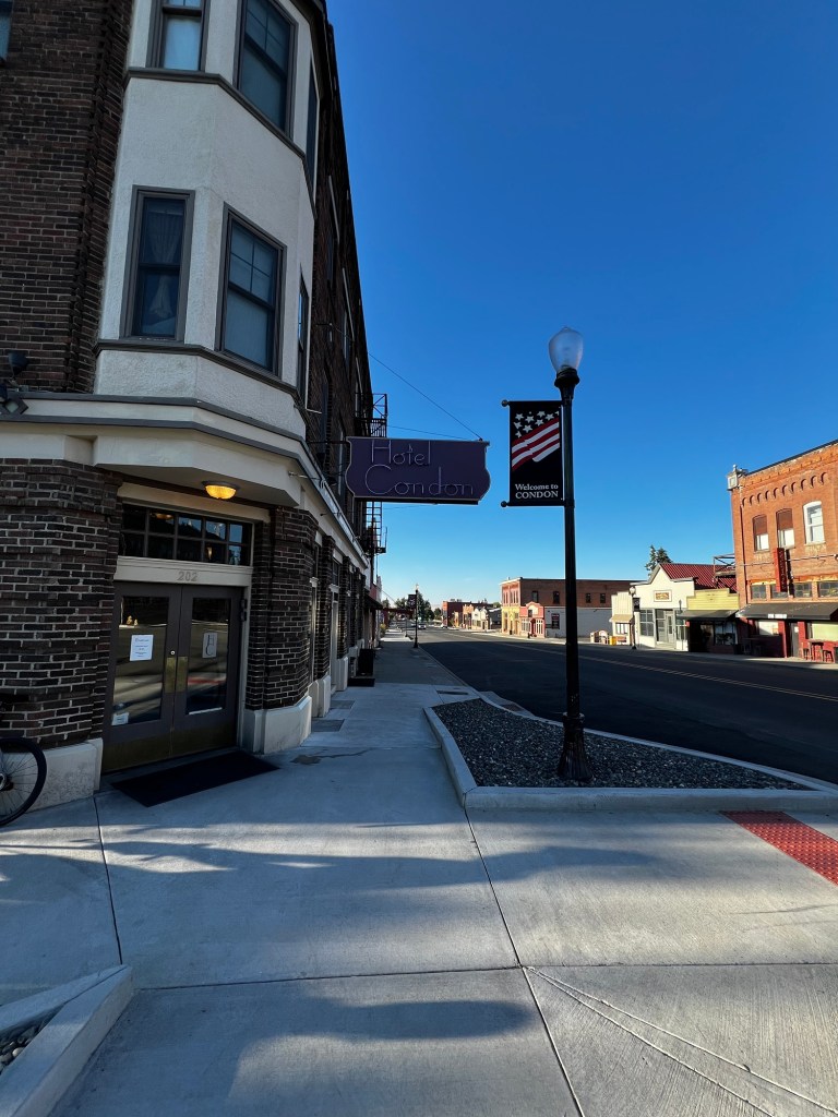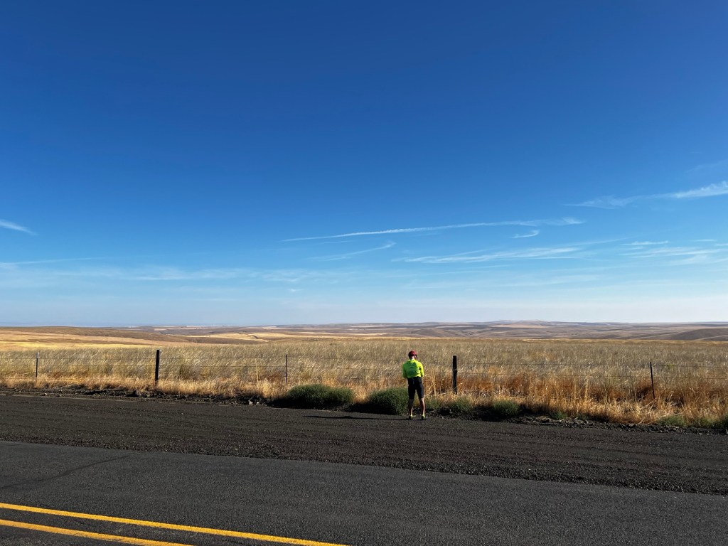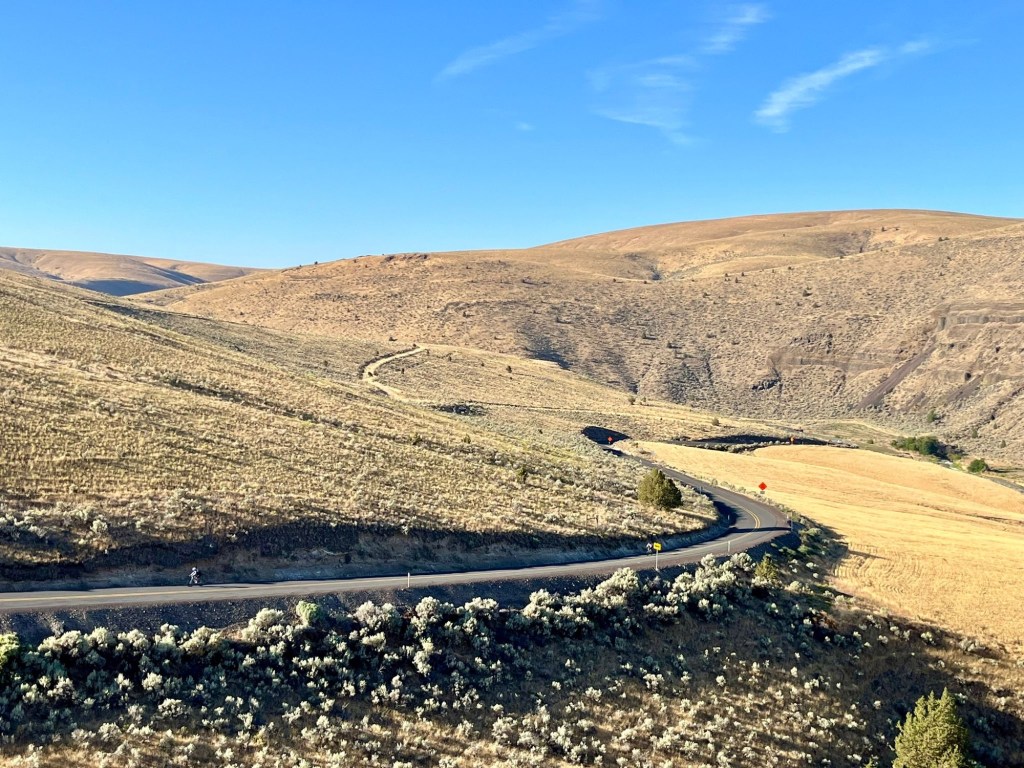 We started in Condon and had 5 climbs but not as big as yesterday. Overall easier but still 90 miles with some heat. Also the landscape doesn’t change much – it was high desert, wheat files and gigantic sky. Very pretty built not much going on!