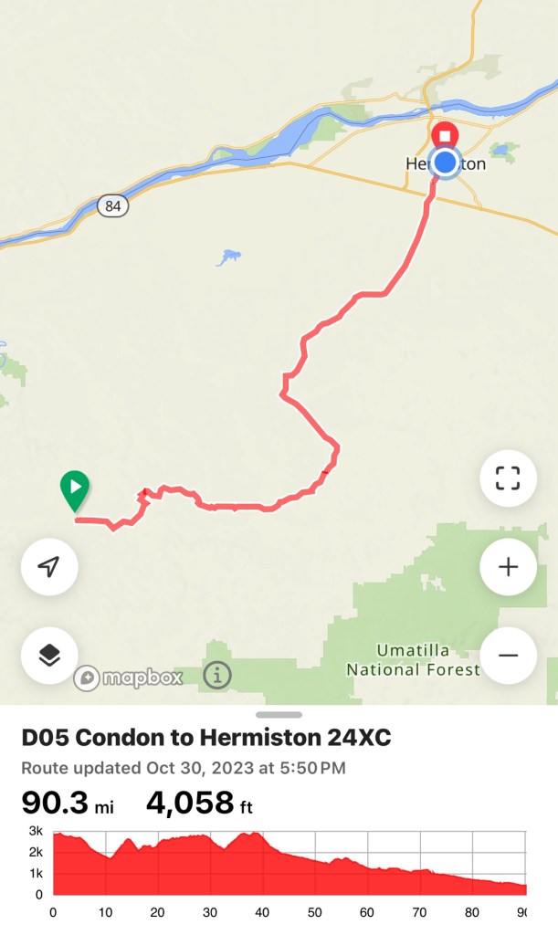 I am still trying to figure out the nutrition and hydration. Today lax on both. At the last rest stop I had no gas. Still poured into Hermiston around 17 mph but had no gas in the tank. The combination of food and chews were not enough today. Plus being windy and hot, it felt like I had a water bottle in my mouth all the time! Yet I’m dehydrated, probs at least a quart low.