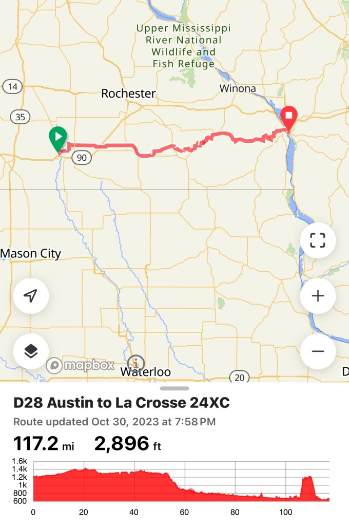 Officially in the east, as crossed the mighty Mississippi! The ride was long and having a huge climb at the end – not ideal. The climb was more than huge, it was 12% for about 1/2 mile, then another kicker at 10% and then another kicker at 15%…you don’t get that from elevation chart. Also, I was sweating so much, felt like water bottle poured on my sunglasses. So my eyes said swim and my legs said spin.. it was a mess.