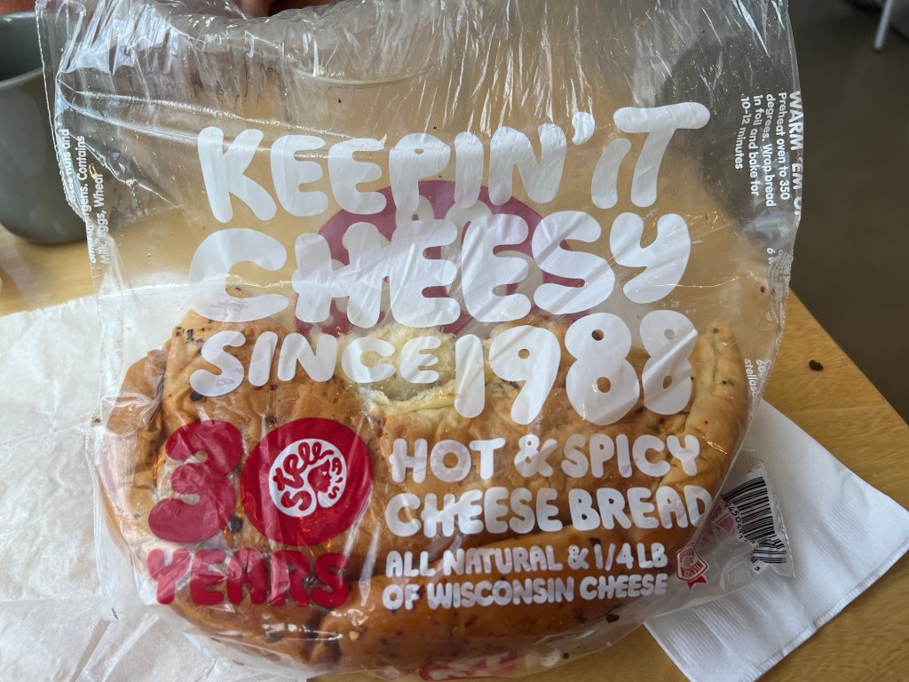 I had gotten a recommendation to buy cheese bread that was “cheesy and spicey”. I finally found it and had to buy a loaf (smallest thing they had). It tasted good but wasn’t particularly cheese or spicey. Mike, guy from New Jersey agreed – hint of cheese and missed on spice. My take a way from WI is there pallets only like it faint!