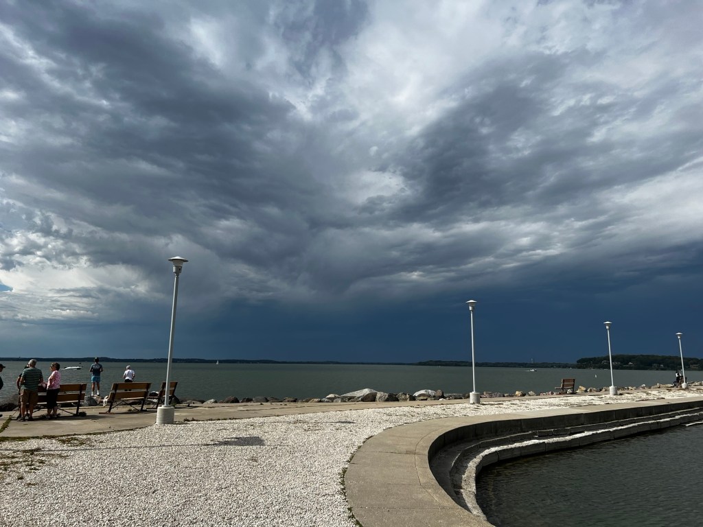 Walked around a bunch, sat a bunch. Had lunch at appropriately named bar – the Weary Traveler Freehouse. Thunderstorm with boomers, lightening and pouring at 4:00!