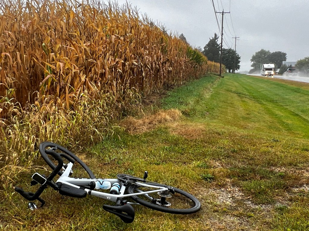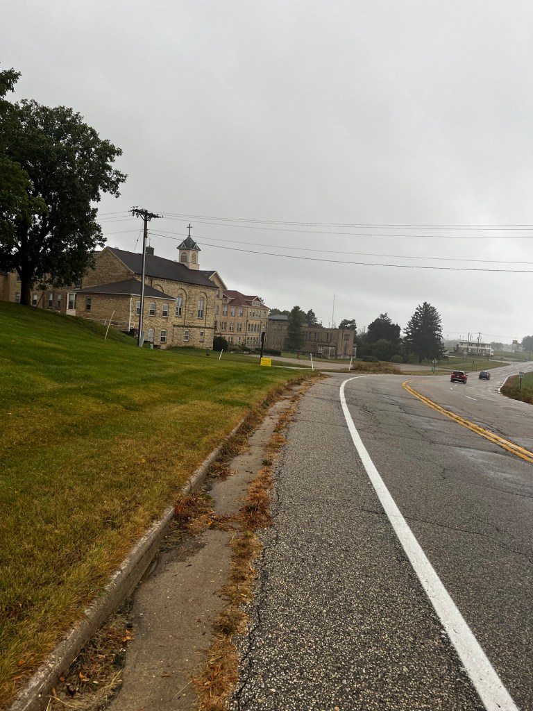 Here is the text I sent: “You know I am ignoring you – sorry about that. I know this is a mess, but it’s my mess “. I redirected and was going to get to Milwaukee anyway possible not riding in the van. Plan A – ride the interstate, get there as fast as possible – I couldn’t find an on- ramp; actually went under freeway three times. Plan B secondary road that was a straight shot – off I went, totally solo (112.1 miles) and no stops (except to pee 6 times and have a few chews). In terms of a tour, kinda messes everything up!