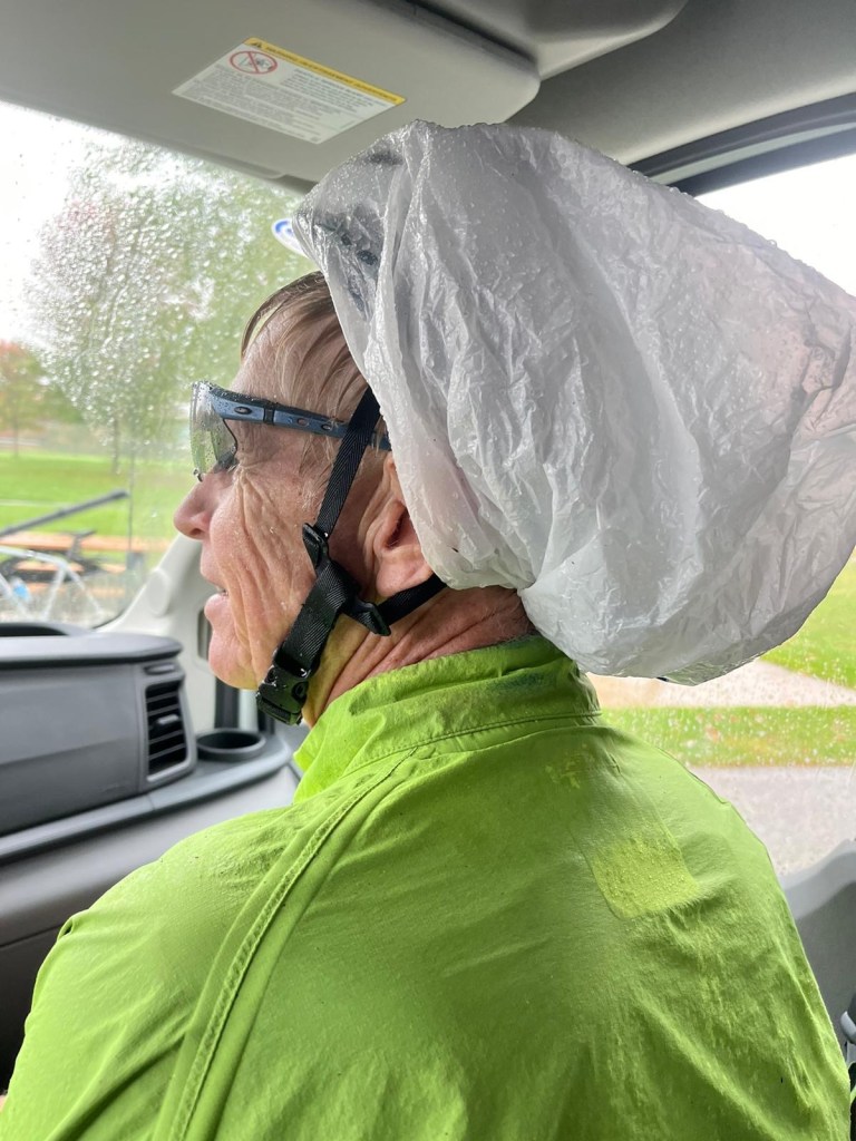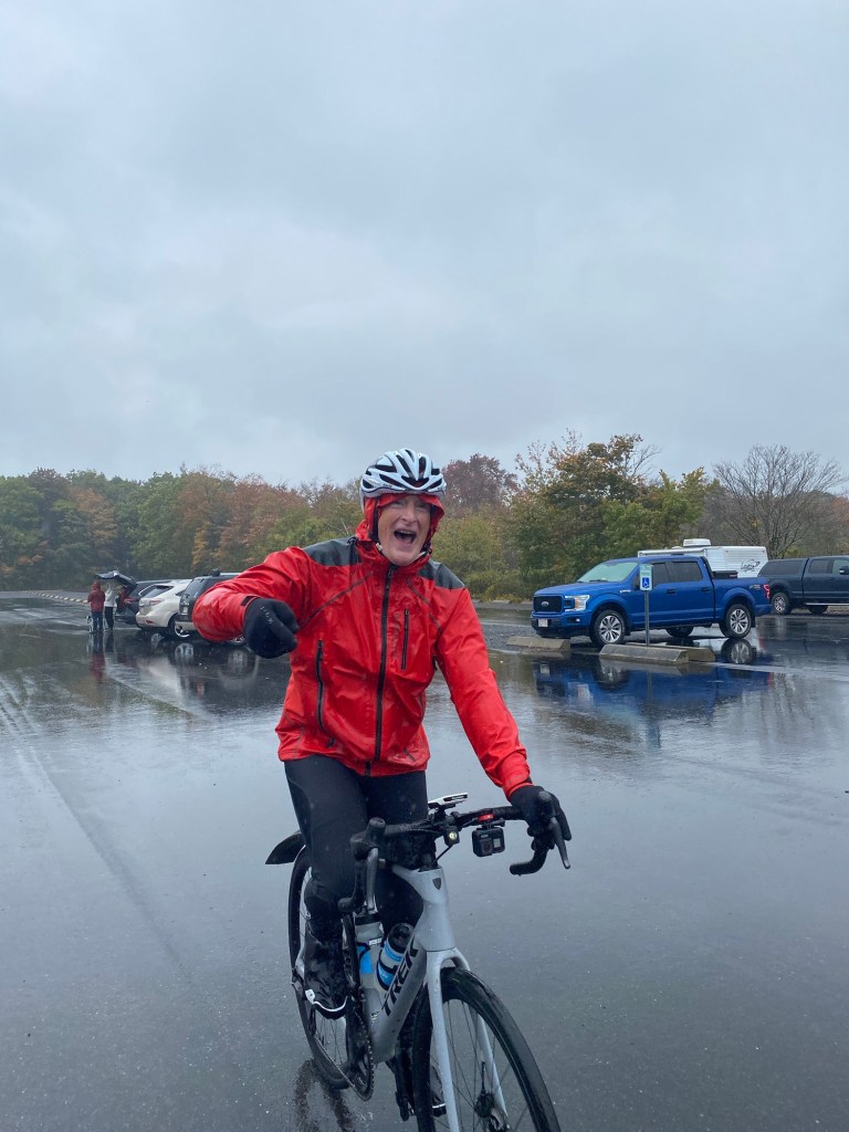Today was the final ride of the trip – shorty of 68-ish miles. Expectations after 4 days of perfect cycling weather that we would have a brief shower. Well…..it poured buckets all day, freezing cold where on any decents the rain felt like ice pellets!!!! We had a pizza party at a park under a gazebo, half the group hopped in the van for heat! We were all soaked to the bone, shivering standing ….had to ride to stay moderately warm. Mo nature was giving us a rude send off.
