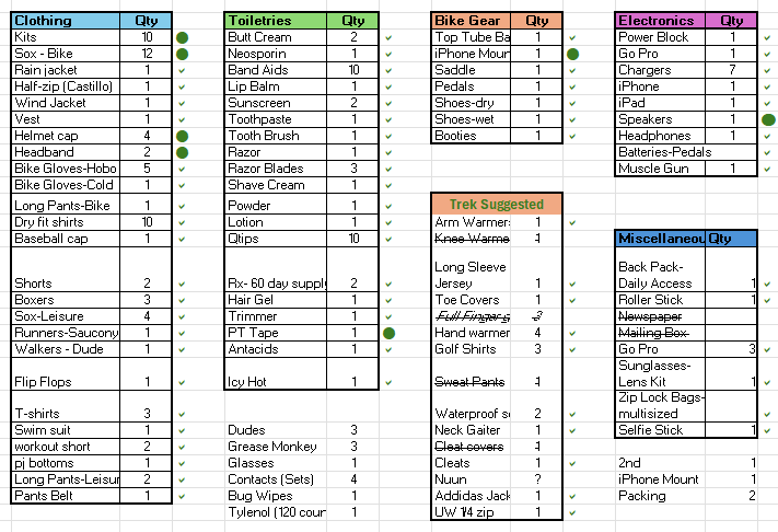 For me, I don’t want to do laundry between rest days if at all possible. That means I need fresh bike clothes daily plus some spares in the event of some food miscue or the weather is so bad you need to swap. Second, I am flying home and have restrictions on suitcase size. So, solution is 2 carry-on suitcases with wheels, 1 gym bag, 1 back pack. Only 1 carry-on will be needed each night. I laid out all my stuff and put into appropriate bags so I know I have room with some extra space for any trinkets along the way.